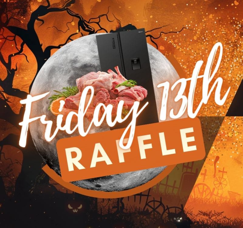 Friday 13th Raffle drawn at 6pm 🎟️ Meat trays + BONUS draw for a black side by side fridge!