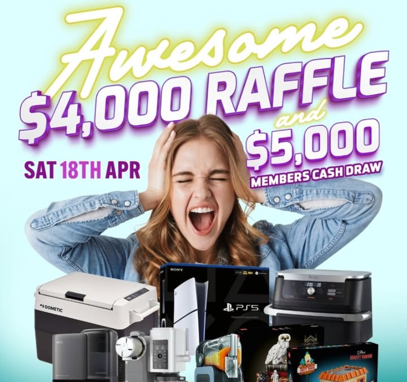 ๐๐ธ Join us on Saturday 18th April at for our Awesome $4k Raffle and $5k Members Cash Draw! ๐คฏ