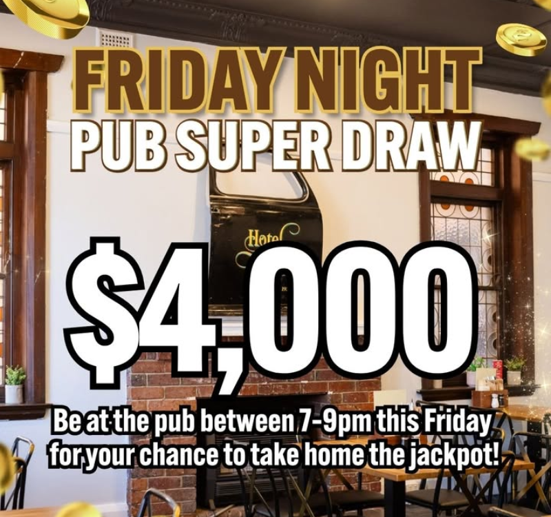 $4K Riverina Pub Super Draw THIS Fri from 7-9pm + Happy Hour from 4:30pm, be here to win!