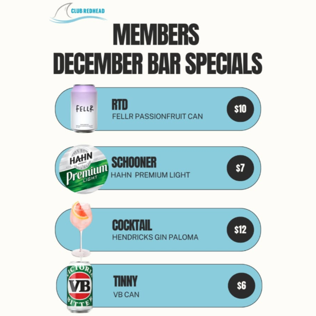 Members can enjoy Bar Specials all month long at Club Redhead!