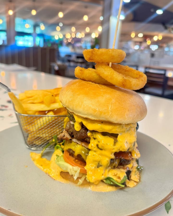 A festive double-stack loaded with two smashed beef patties, crispy bacon, melted cheese, jalapeños, fresh salad and crunchy onion-ring “antlers”, all topped with our signature house sauce.