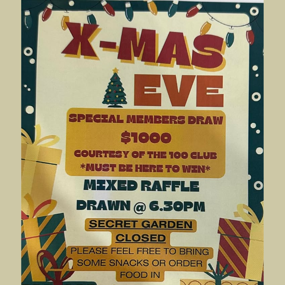 Posted on December 18, 2025December 19, 2025 by Scott SmithChristmas Eve cheer 🎄 $1000 Members Draw courtesy of the 100 Club + Mixed Raffle drawn 6:30pm! Sure! Could you please provide the string that you want me to remove emojis from?