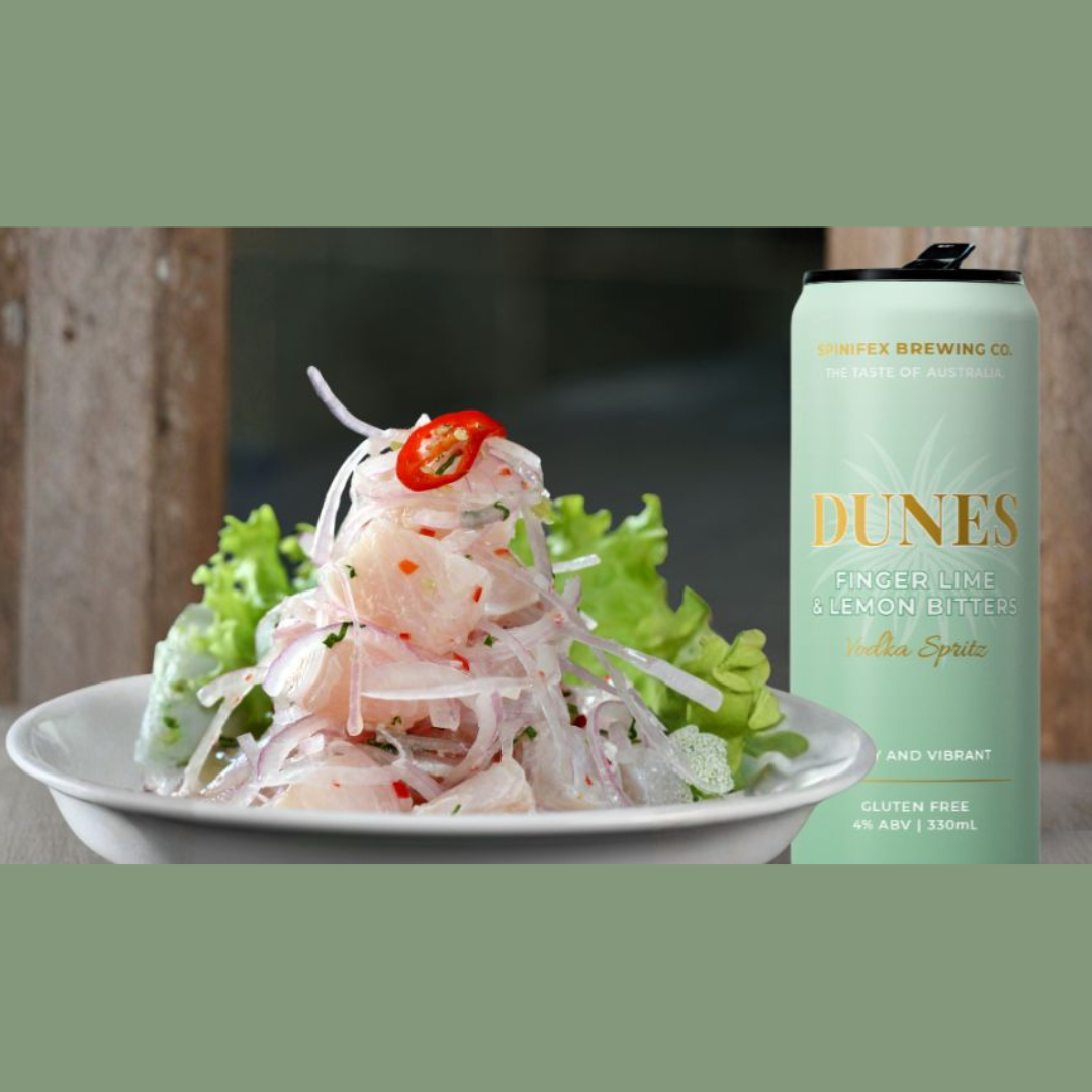 Dice the fish and chill while you prep. Mix lime juice with our Dunes Finger Lime & Lemon Bitters, zest and chilli, then gently cure the fish until just opaque. Fold through onion, coriander, olive oil, salt and pepper, taste (important), and serve straight away.