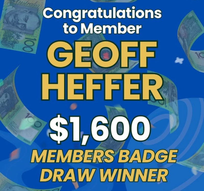 👏💰 Big congrats to member Geoff Heffer who was the lucky winner of the Members Badge Draw last week (Thu 26 March), taking home the $1,600 jackpot!!