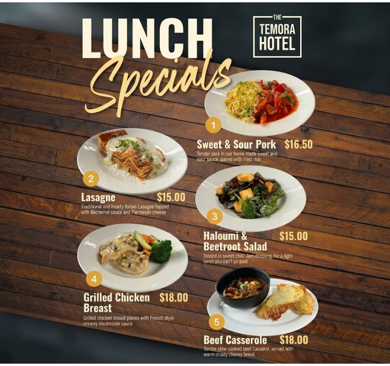 😋🍽️ Enjoy delicious lunch specials every day at Temora Hotel!