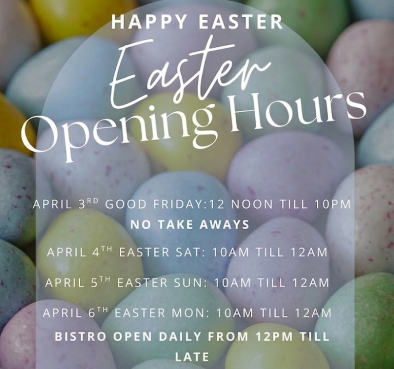 Our hours are slightly different Good Friday opening at 12 noon and closing at 10pm, with no takeaway alcohol sales.