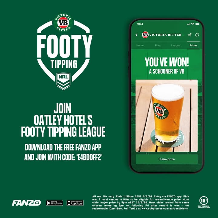 Download the free app FANZO, use the Oatley Hotel Code: E4BDDFF2 or scan the QR code in venue and follow the prompts.