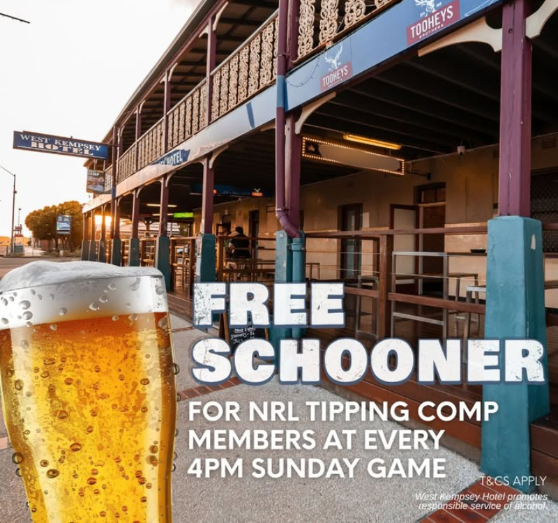FREE schooner + Sunday footy = winning combo πΊπ Tipping comp members get 1 x free schooner at every 4pm Sunday game. Dolphins vs Rabbitohs this Sunday – lets go!