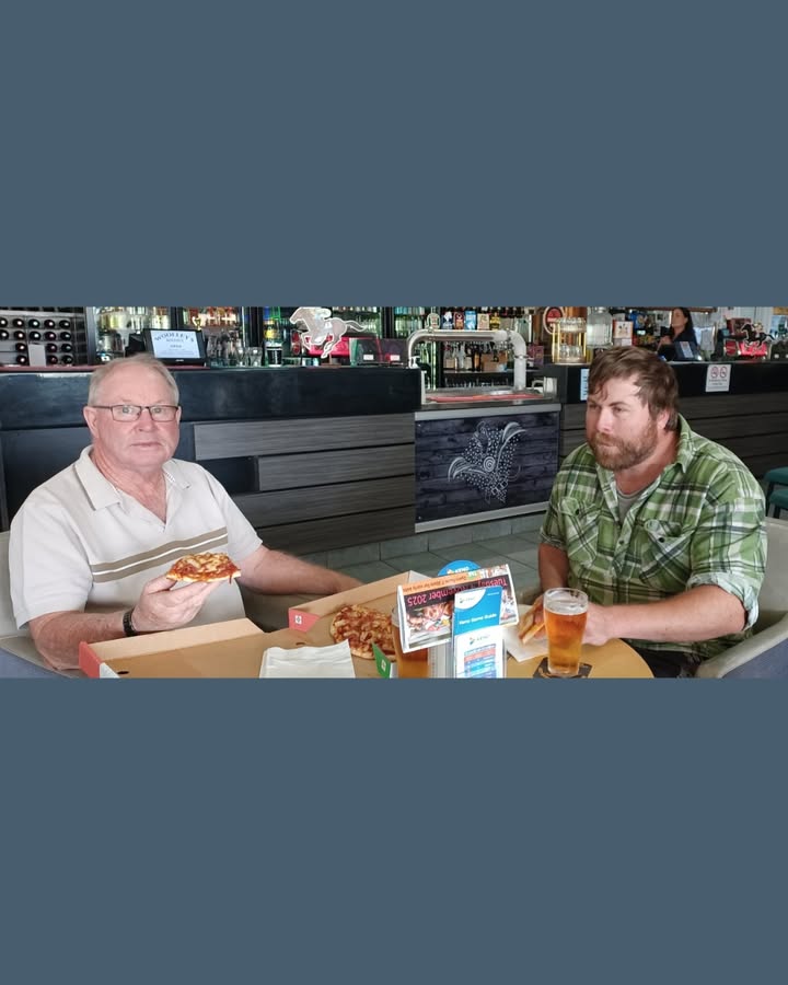 Graham and Bradley enjoying pizza from Woolley’s Bistro