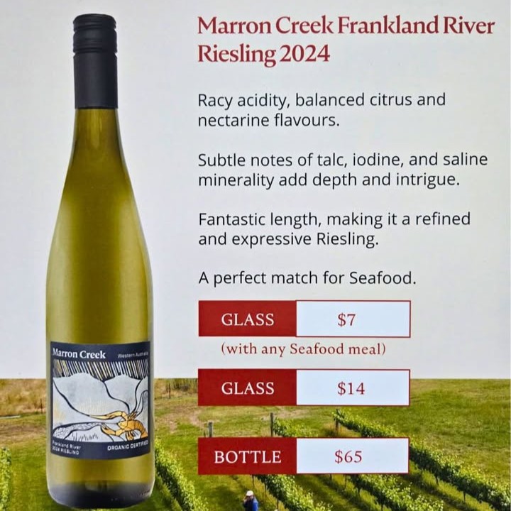 Get a glass of Marron Creek’s Frankland River Riesling for only $7 when you purchase any of our delicous Seafood Meals from the Lakeview Restaurant!