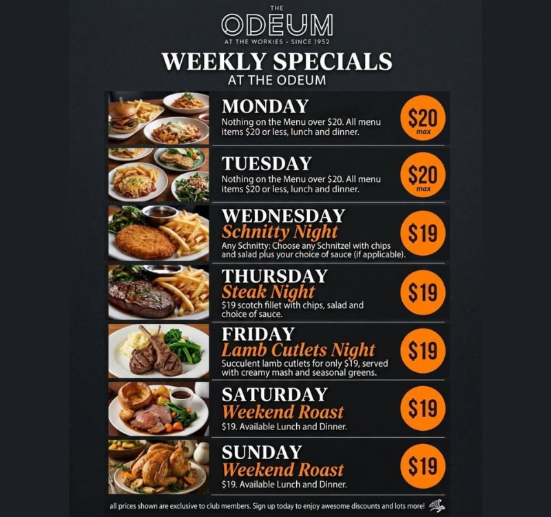 So next time you’re heading to The Workies for bingo, trivia, the footy or a catch-up with mates, make sure you stop by The Odeum and enjoy a great meal while you’re there. Members enjoy amazing specials EVERY night of the week!