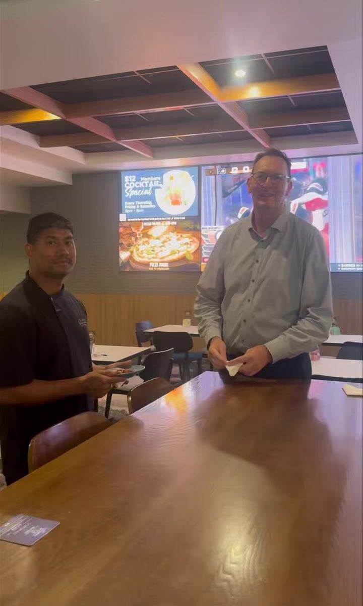 Standing with Chef Sam as I take on his legendary hot wings challenge.