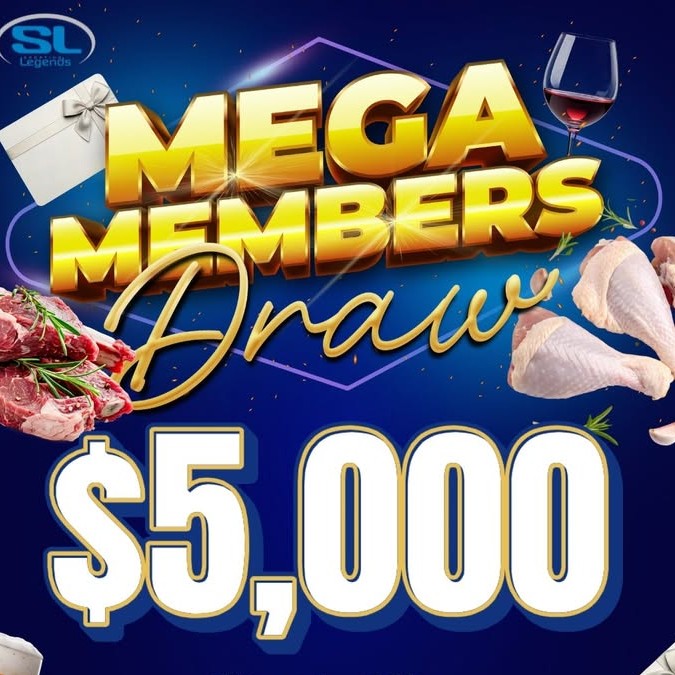 Mega Members Draw MUST-WIN $5K jackpot TONIGHT at 6pm πŸ’° Raffles at 7:30pm & Legends Golf!