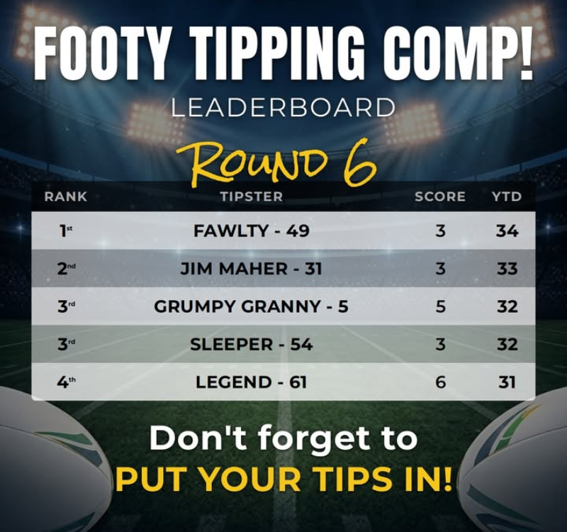 Well done to our Round 6 Footy Tippers – with Fawtly taking the lead with a very close lineup. Remember to get your tips in!