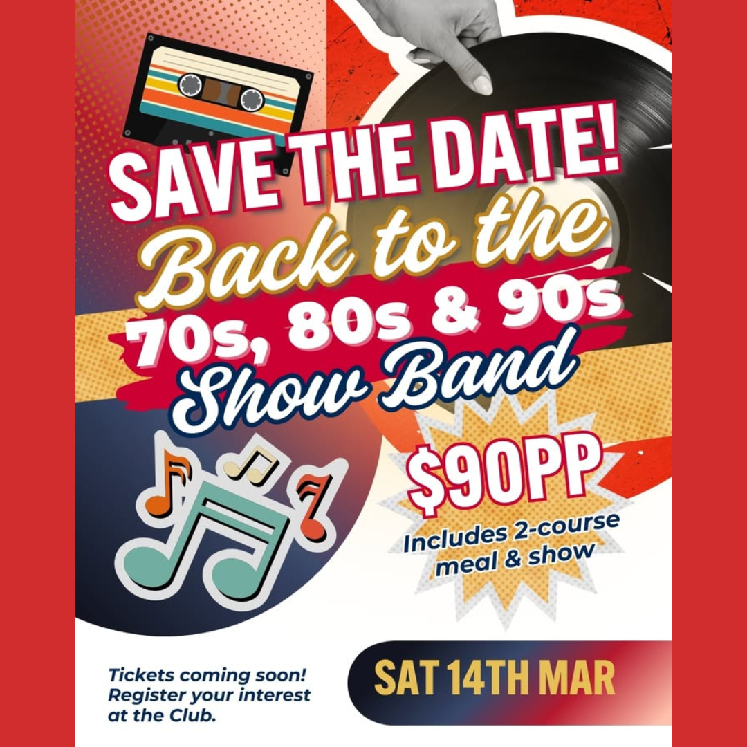 Save the date 🎸 Back to the 70s, 80s & 90s Showband on March 14 – $90pp inc dinner, register now!