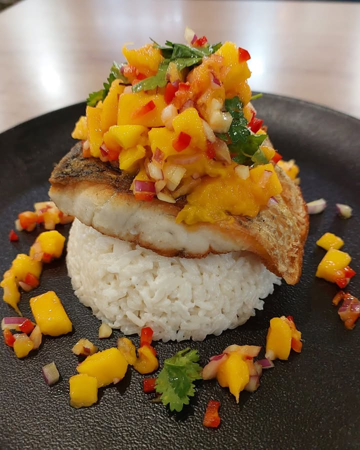 π Panfried Barramundi on coconut rice, with fresh mango salsa – $32