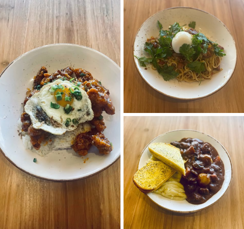Served in a hot honey sauce with a sticky coconut and ginger rice topped with spring onion and Asian herbs and a fried egg.