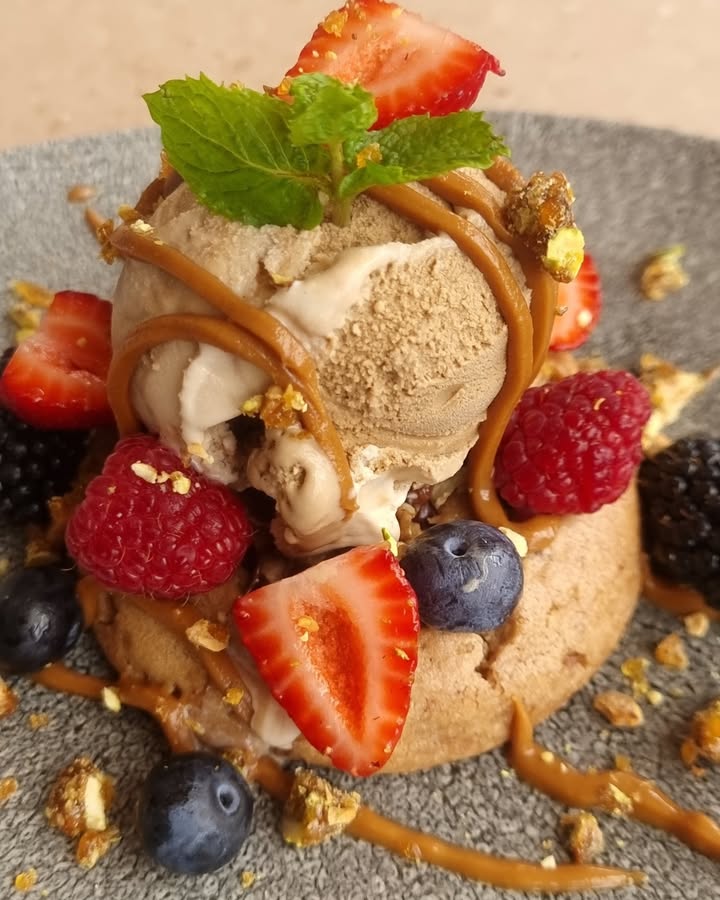 🍪 Loaded Cookie: Coffee ice cream, pistachio praline, Biscoff drizzle & fresh berries